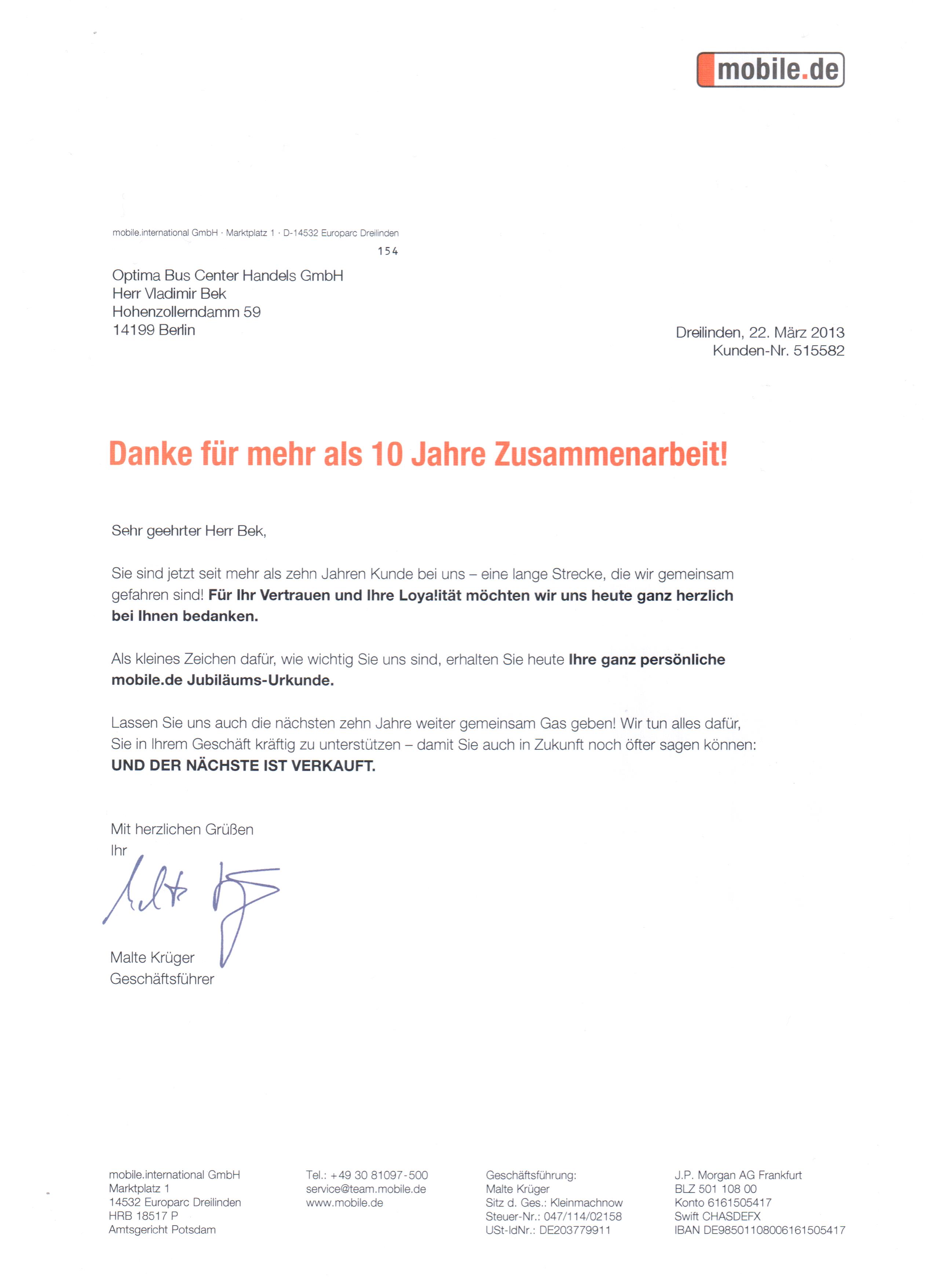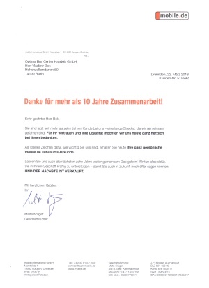 Компания OptimaBusCenter получила Благодарственное письмо и Сертификат с благодарностью от компании mobile.de, за более чем 10-ти летнию совместную работу