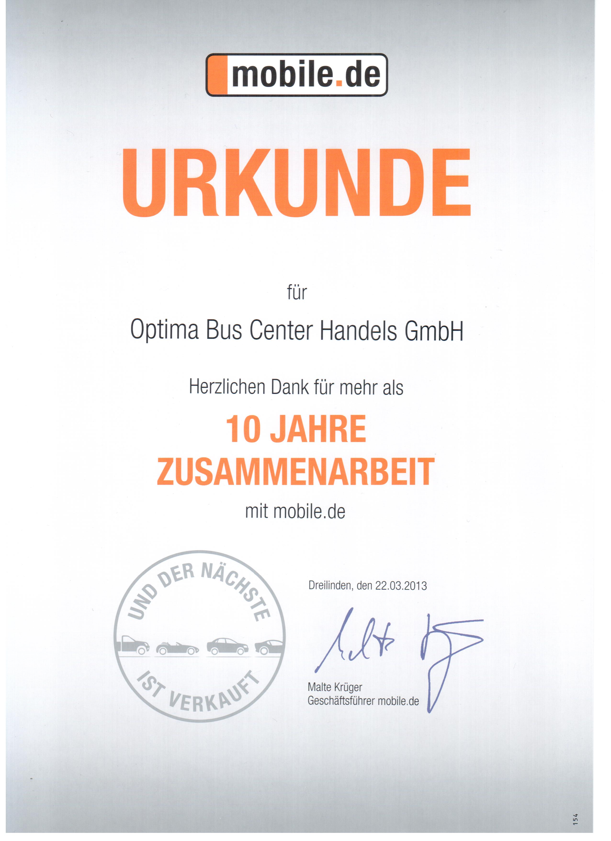 Компания OptimaBusCenter получила Благодарственное письмо и Сертификат с благодарностью от компании mobile.de, за более чем 10-ти летнию совместную работу